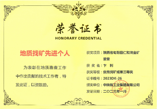 中陜核工業(yè)集團有限公司2022年度優(yōu)秀找礦成果三等獎 陜西省旬陽縣仁河灣金礦普查項目