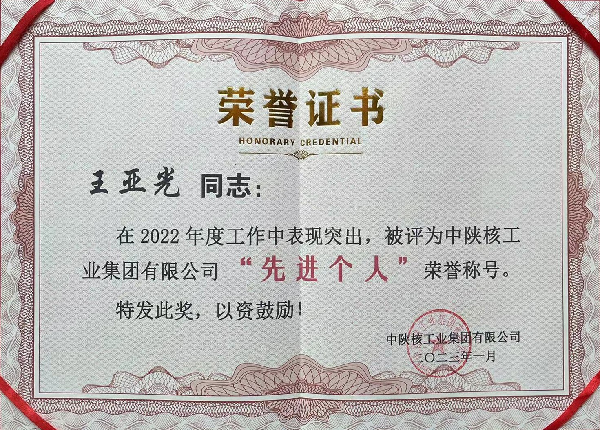 中陜核工業(yè)集團(tuán)有限公司2022年度先進(jìn)個(gè)人 王亞光