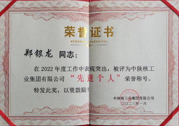 中陜核工業(yè)集團(tuán)有限公司2022年度先進(jìn)個(gè)人 鄭銀龍