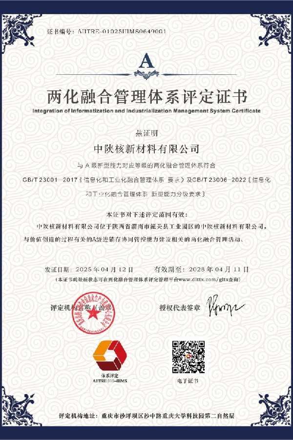 4月12日,中陜核新材料有限公司順利通過全國信息化和工業(yè)化融合管理標(biāo)準(zhǔn)化技術(shù)委員會(huì)GB/T 23001-2017《信息化和工業(yè)化融合管理體系要求》體系認(rèn)證“兩化融合管理體系評(píng)定證書A”,獲評(píng)范圍:與價(jià)值創(chuàng)造的過程有關(guān)的A級(jí)進(jìn)銷存協(xié)同管控能力建設(shè)相關(guān)的兩化融合管理活動(dòng)。標(biāo)志著新材料公司在信息化與工業(yè)化深度融合領(lǐng)域取得重要進(jìn)展。