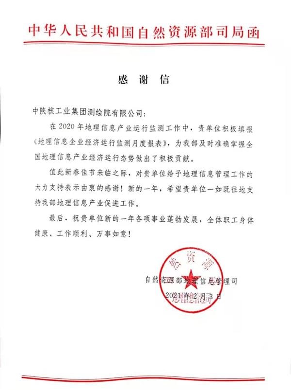 這份感謝信,既是中國自然資源部對(duì)測(cè)繪院工作的充分肯定,也是激勵(lì)測(cè)繪院繼續(xù)在高質(zhì)量發(fā)展道路上砥礪前行的奮進(jìn)力量。測(cè)繪院定將繼續(xù)追夢(mèng)奔跑,奮勇爭(zhēng)先,為圓滿完成2021年工作任務(wù)而不懈奮斗。