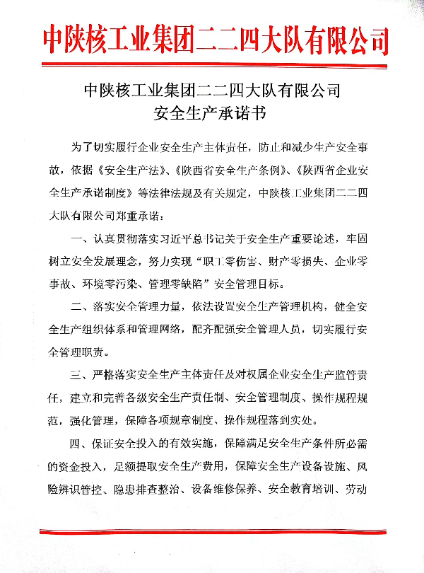 中陜核工業(yè)集團二二四大隊有限公司安全生產(chǎn)承諾書