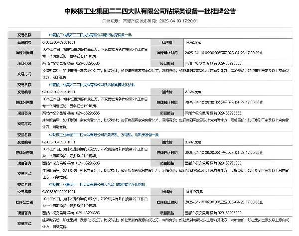 根據(jù)省國資委及中陜核工業(yè)集團(tuán)有限公司國有資產(chǎn)管理相關(guān)規(guī)定,中陜核工業(yè)集團(tuán)二二四大隊(duì)有限公司擬對部分閑置鉆探類資產(chǎn)設(shè)備進(jìn)行處置,現(xiàn)委托西部產(chǎn)權(quán)交易所對該批資產(chǎn)設(shè)備進(jìn)行公開掛牌,歡迎有意向的單位或個人咨詢報名。