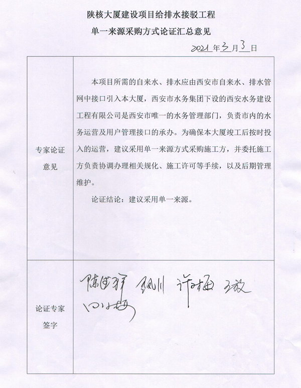 六、附件:陜核大廈建設項目給排水接駁工程單一來源采購方式論證匯總意見(如圖)
